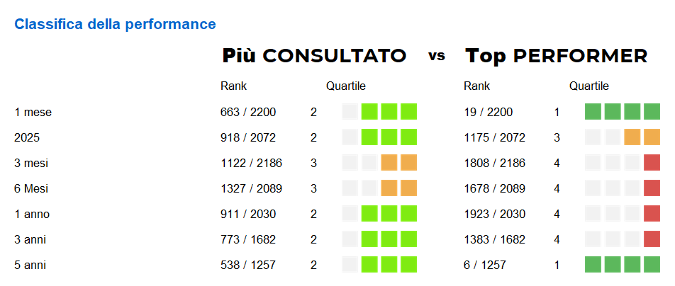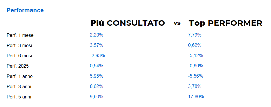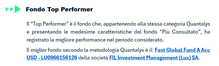 Scopri le schede Quantalys del fondo “Più Consultato” e del fondo “Top Performer”, appartenente alla stessa categoria Quantalys di settembre 2025.