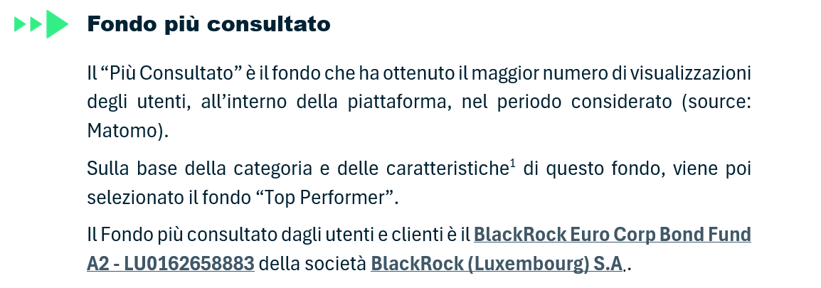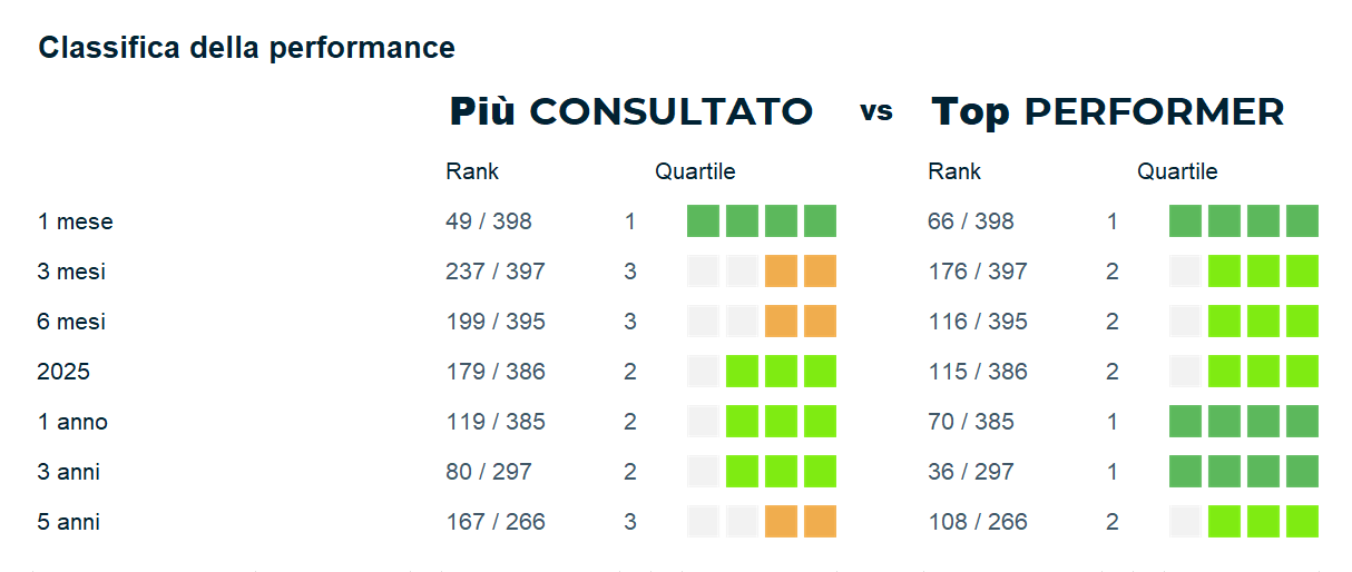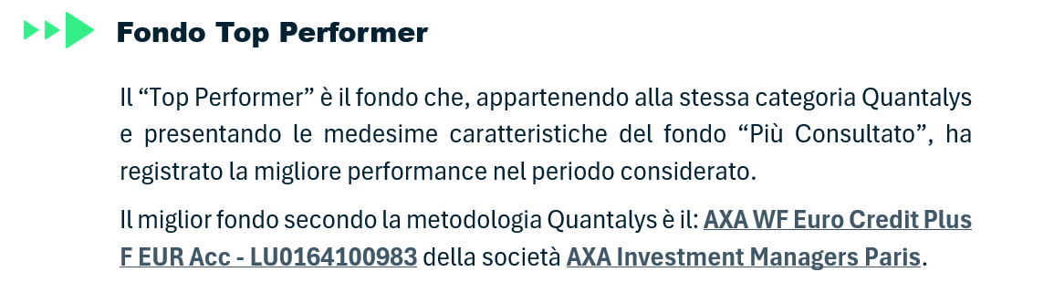Scopri le schede Quantalys del fondo “Più Consultato” e del fondo “Top Performer”, appartenente alla stessa categoria Quantalys di novembre 2025.