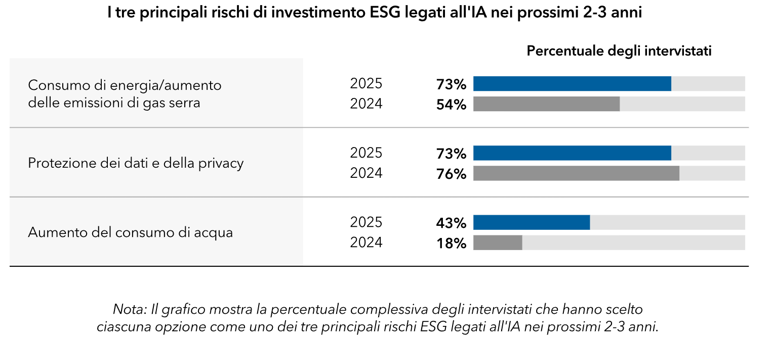 Oltre il 40% degli intervistati considera l'aumento del consumo idrico come il rischio di investimento ESG più rilevante legato all'IA nei prossimi 2-3 anni, in aumento rispetto al 18% dello scorso anno.