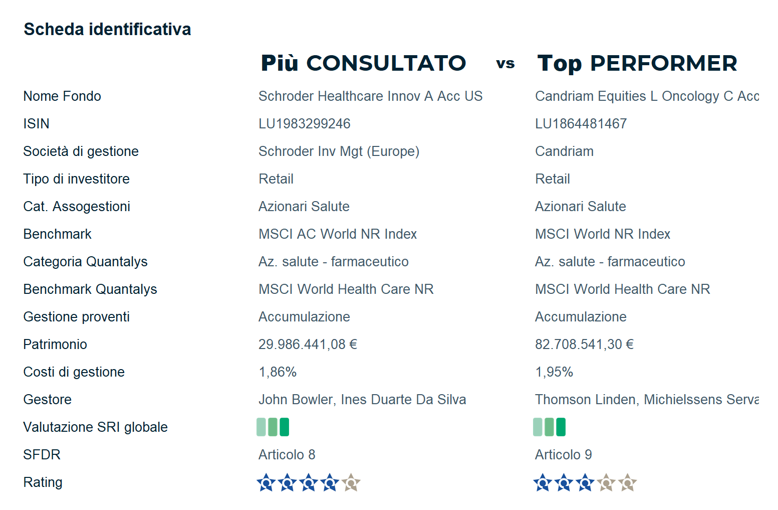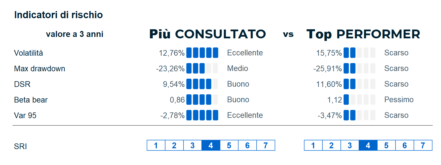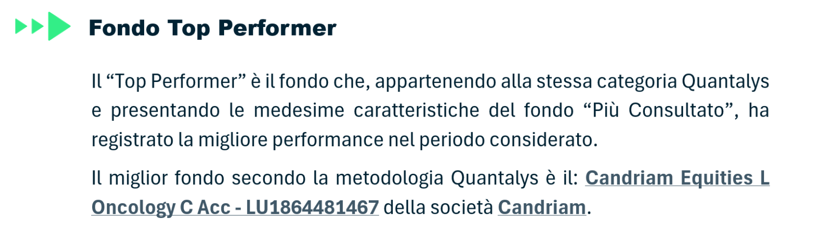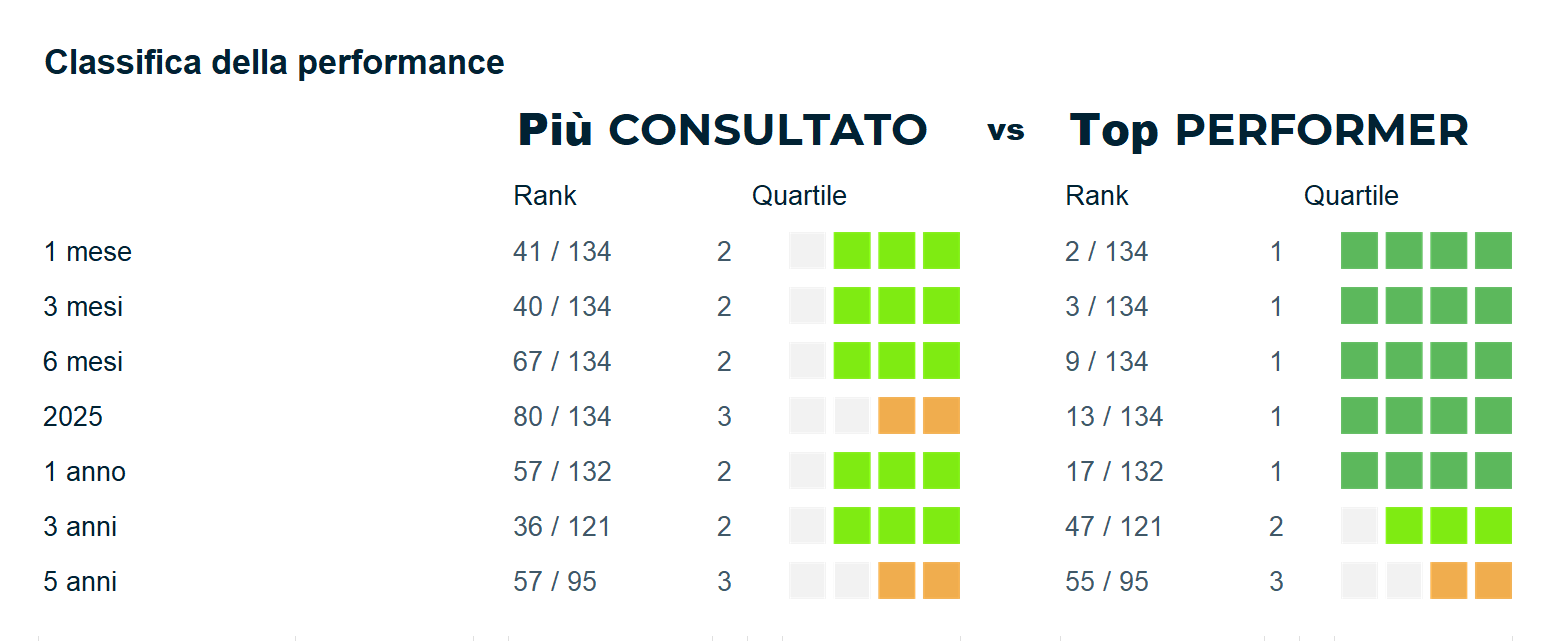 Scopri le schede Quantalys del fondo “Più Consultato” e del fondo “Top Performer”, appartenente alla stessa categoria Quantalys di dicembre 2025.