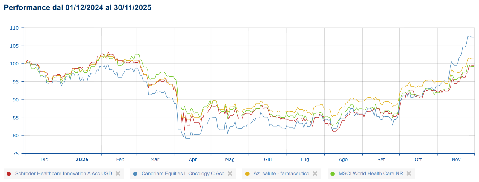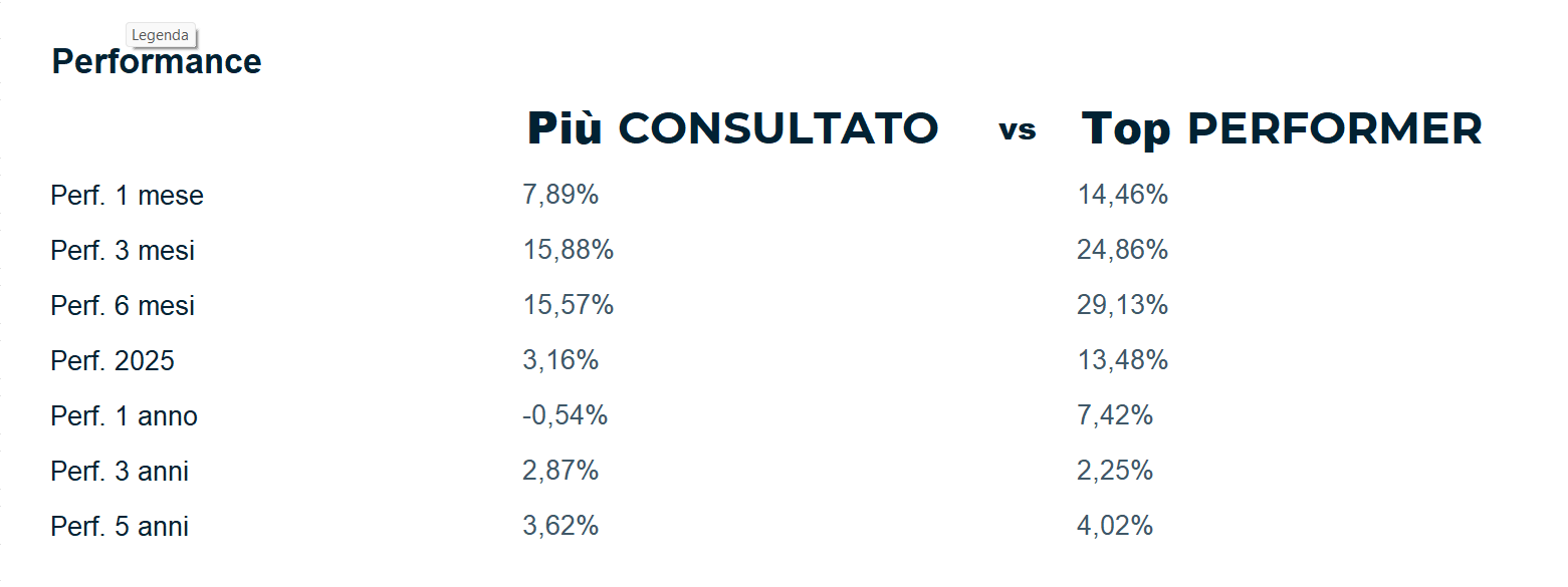 * La metodologia utilizzata per l'elaborazione dei dati è interna a Quantalys. I calcoli sono aggiornati al 30/11/2025. I calcoli sono effettuati da Quantalys e sono basati sui dati inviati giornalmente dalle società di gestione. Eventuali errori o omissioni sono di esclusiva responsabilità di Quantalys. Nonostante la massima cura prestata nella raccolta, nella verifica e nell’elaborazione dei dati provenienti da fonti ritenute affidabili, Quantalys non garantisce che i dati ricevuti siano accurati. Tutti i calcoli sono effettuati in euro.
