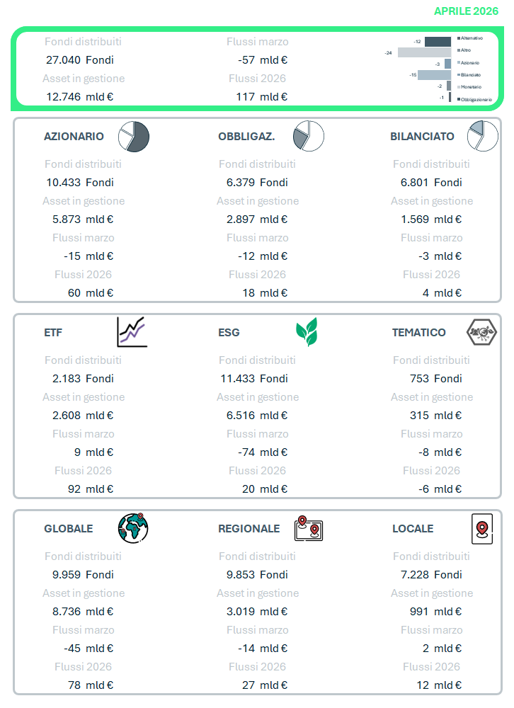 27.040 fondi distribuiti in Europa per un totale di 12.746 miliardi di Euro di masse gestite, scopri l'analisi mensile di aprile 2026 sull'andamento della Raccolta in Europa!