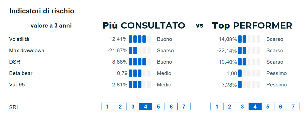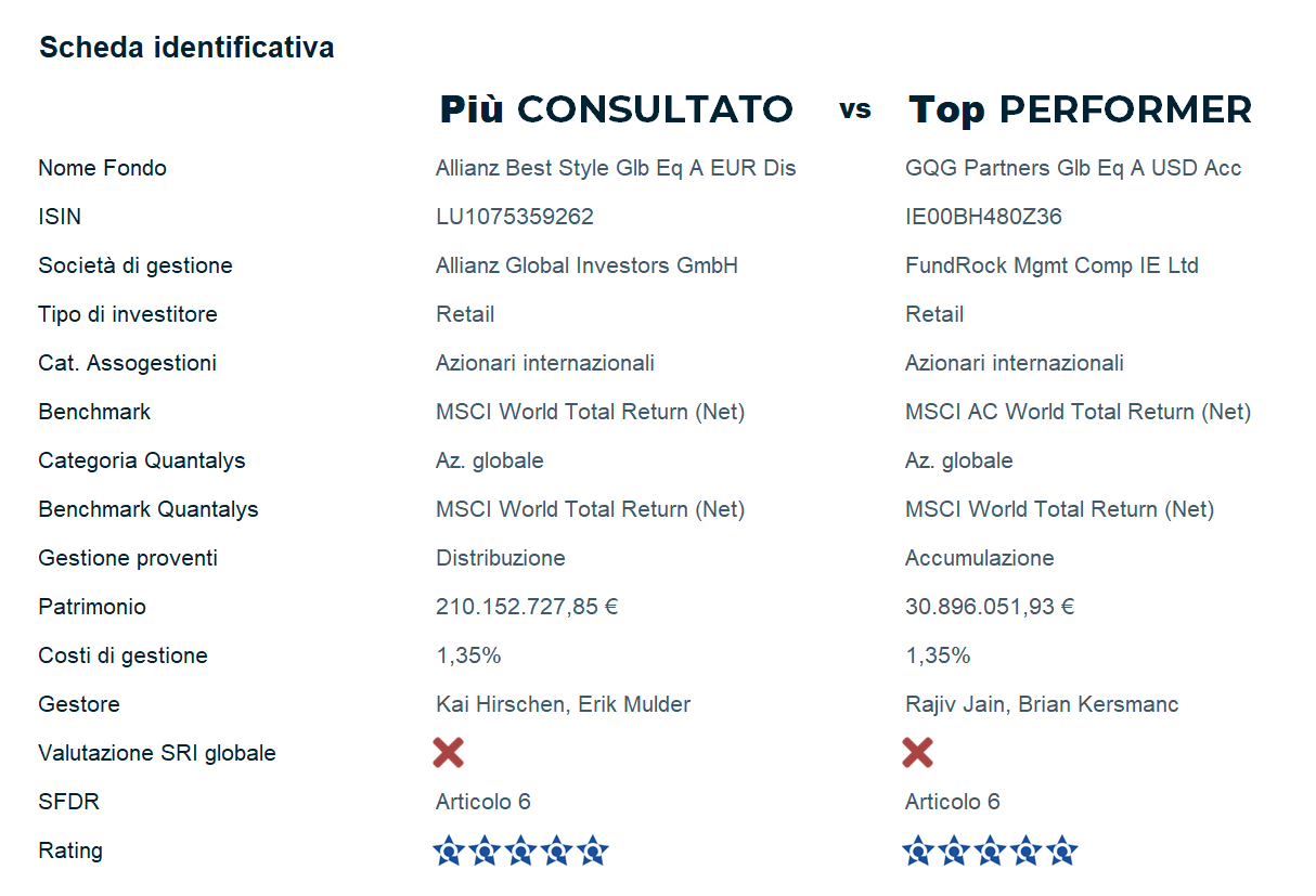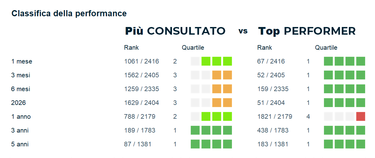 Scopri le schede Quantalys del fondo “Più Consultato” e del fondo “Top Performer”, appartenente alla stessa categoria Quantalys di aprile 2026.